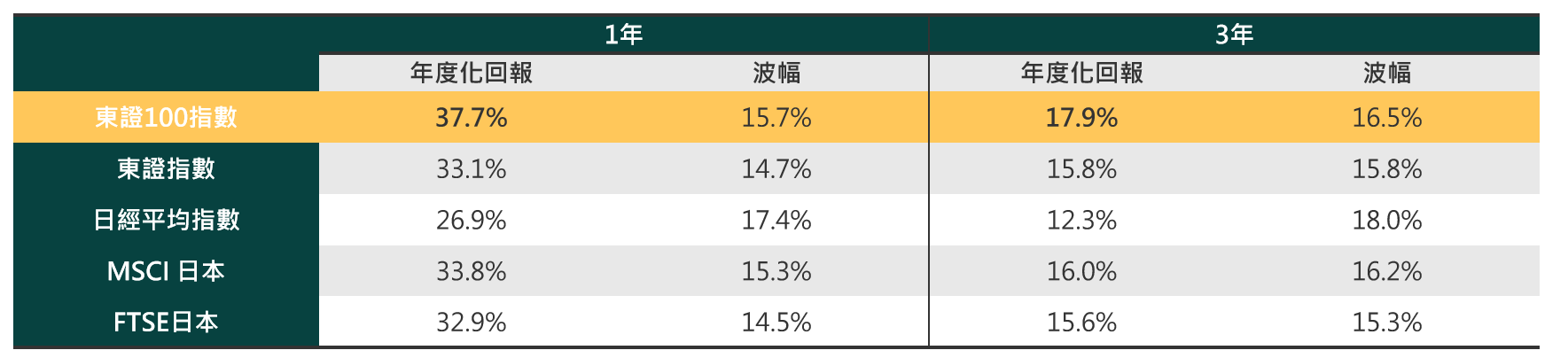資料顯示,東證100指數1年和3年的年化回報分別達到37.7%和17.9%,均高於東證指數、日經平均指數等其他日本指數,波幅較日經平均指數也相對穩定。其行業分佈均勻,對比日經225有更多金融,工業佔比,風險回報比例較高,持股較集中,動力較強。與日經平均指數相比,其波幅更為穩定,顯示出強大的市場動力。