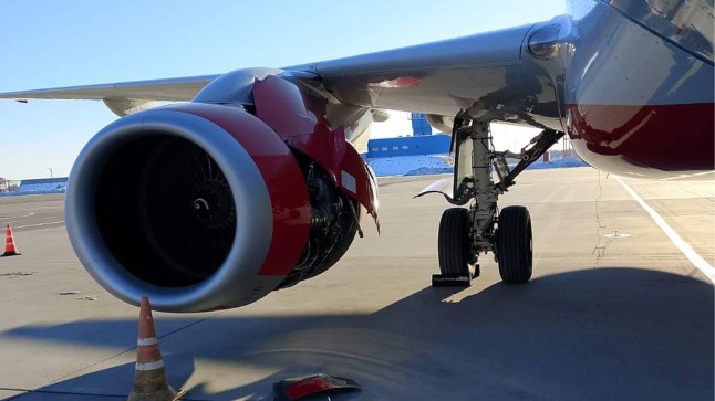 Videos and images circulating online show missing parts of the right engine’s metal covering.